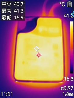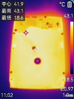 读写结束后关机断电,将硬盘翻过来,用热成像仪记录硬盘底部的温度,由于硬盘底部之前是紧贴在桌面上,长时间的连续工作已经将桌面加热,被动散热达到极限,底部温度略高一些,最高达到了43.1度,也只是略高于正面温度,发热表现极佳。