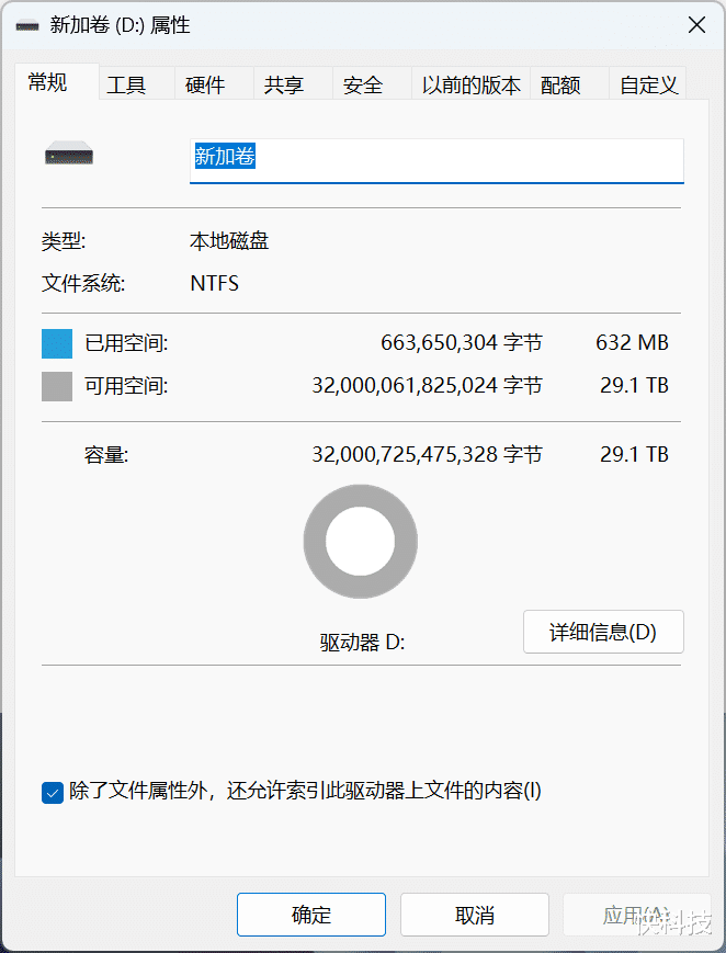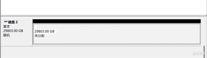 在Windows磁盘管理中,希捷银河Exos 32TB硬盘格式化前容量为29803.00GB,可分配容量为30518270MB,格式化之后可用空间为29.1TB,32000061825024字节。