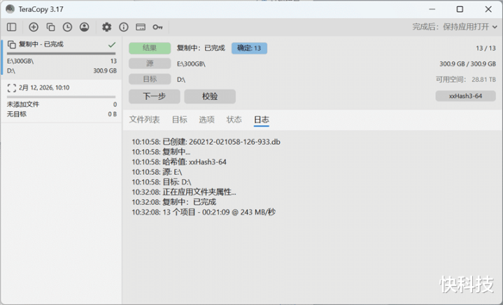 300GB的大文件全部从SSD复制到希捷银河Exos 32TB硬盘中,共用时21分9秒,平均速度为243MB/s,注意使用Windows资源管理器或其他不同的第三方拷贝工具,都会对这个速度产生影响,所以仅供参考。