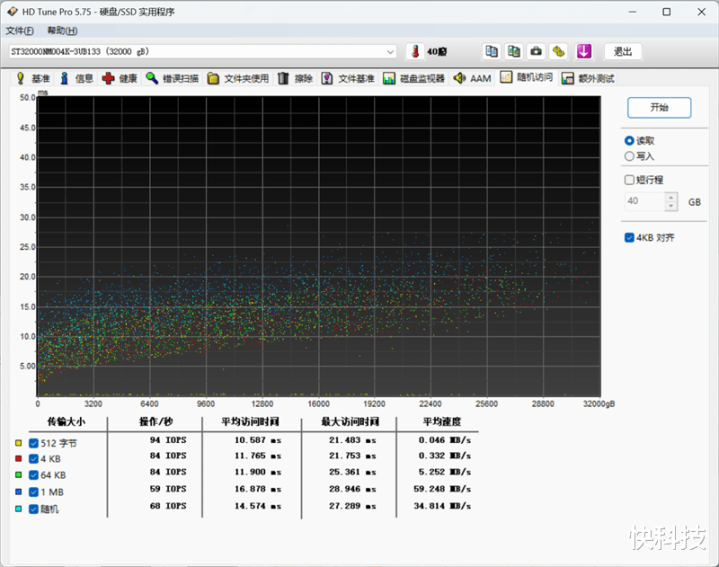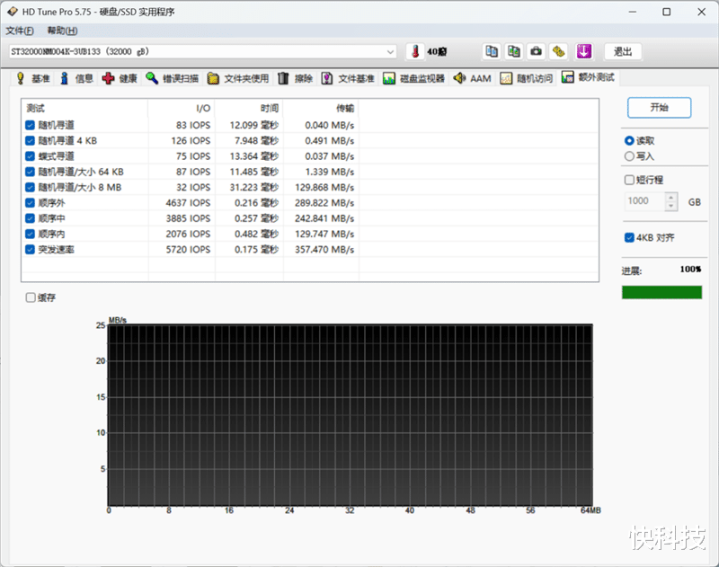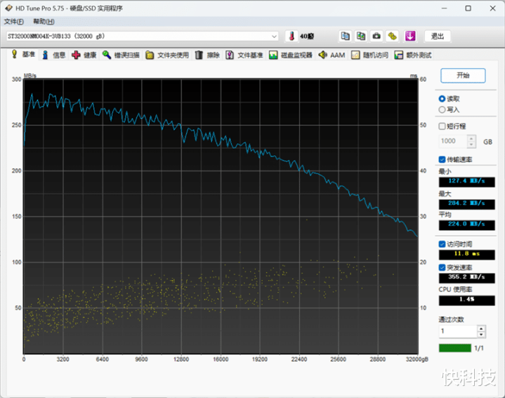 在HD Tune测试软件比较老,但对于机械硬盘的性能测试也更加全面,我们用它测试希捷银河Exos 32TB硬盘,可以更直观的看到在机械硬盘的物理结构下,碟片外圈和内圈之间的性能差别。