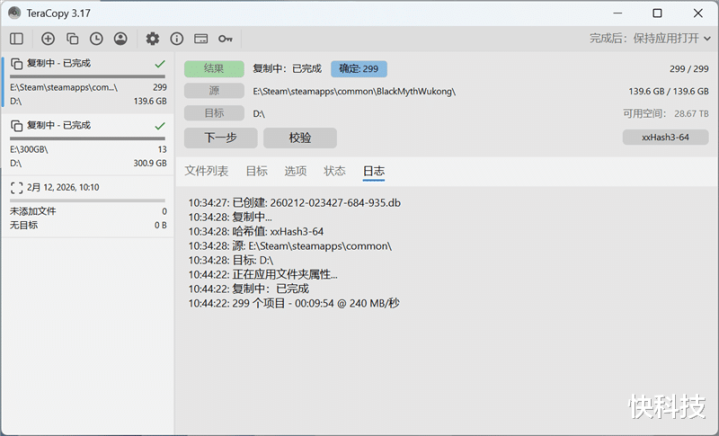 从SSD向希捷银河Exos 32TB硬盘中复制《黑神话·悟空》的139GB游戏安装包,共用时9分54秒,平均速度240MB/s,和连续写入大文件时差别不大。