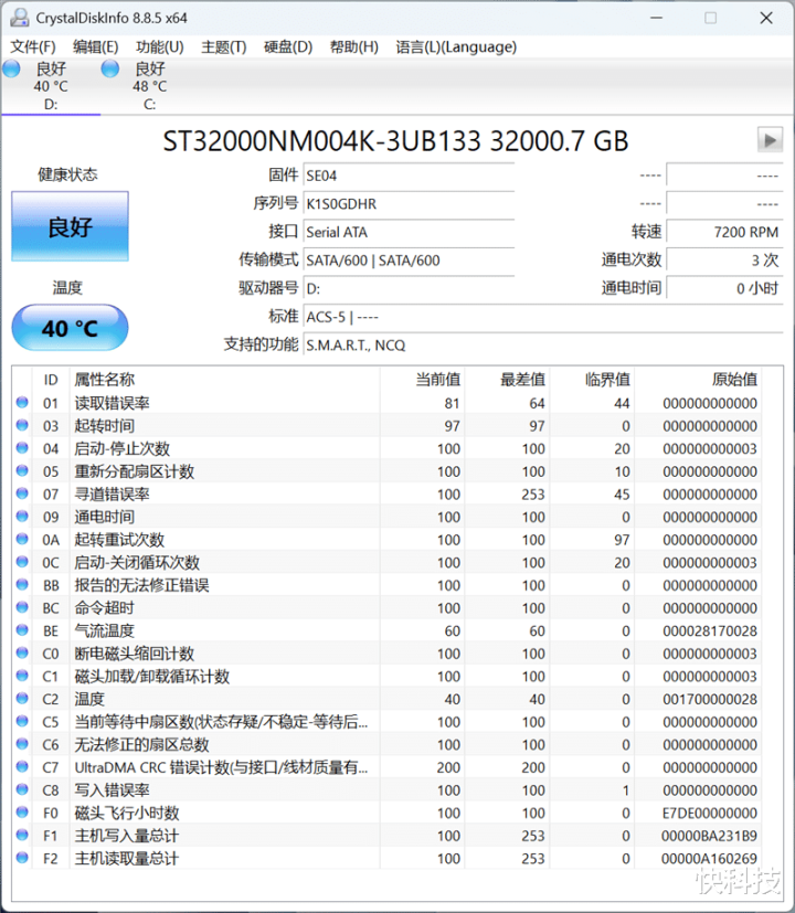 CrystalDiskInfo中查看希捷银河Exos 32TB硬盘的信息,容量识别为32000.7GB,转速7200RPM,传输模式为SATA/600,室温约26度的环境下,待机温度为40度。