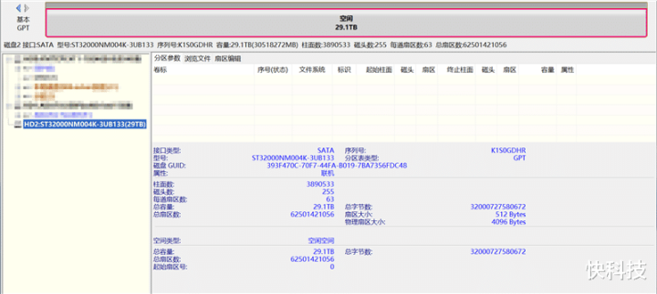 DiskGenius磁盘精灵中查看希捷银河Exos 32TB硬盘的信息,容量为29.1TB(30518272MB),柱面数3890533,总扇区数62501421056,总字节数32000727580672。