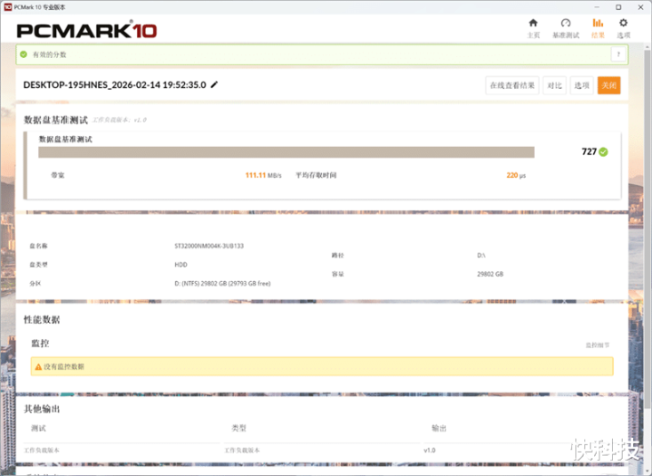 希捷银河Exos 32TB硬盘在测试中成绩为727,带宽为111.11MB/s,平均存取时间为220微秒。