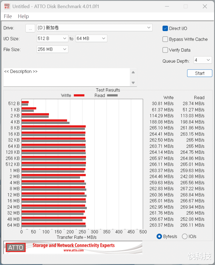 希捷银河Exos 32TB硬盘在ATTO Disk Benchmark测试中的成绩略低一些,但同样可以保持260MB/s以上的稳定读写速度,而且是从8KB文件尺寸开始,就已经达到了最高值,小文件读写是性能并不会有断崖式降低。